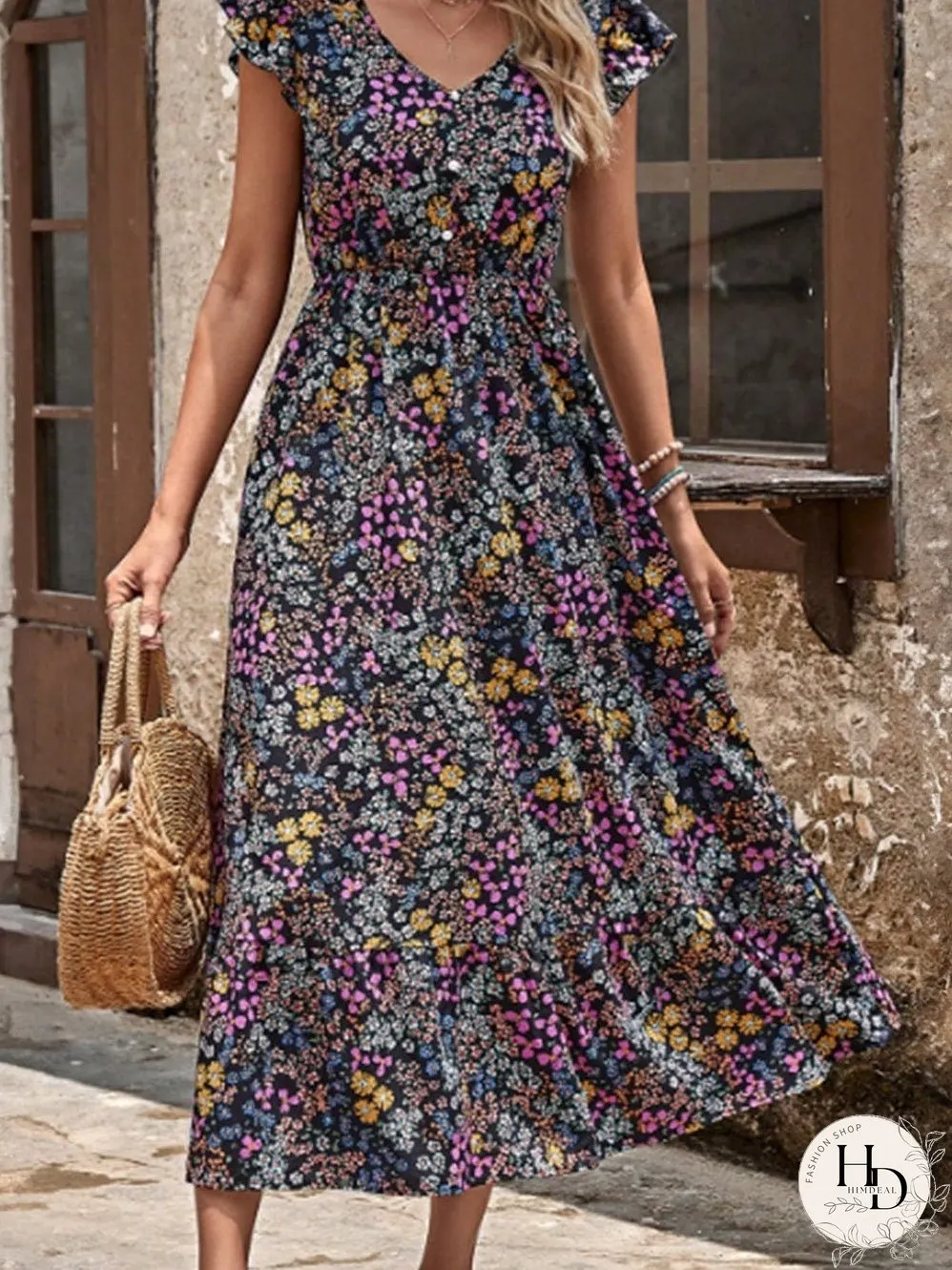 Upgrade your wardrobe with our Black Floral Ruffled Sleeve V Neck Buttoned Midi Dress, a versatile piece perfect for various occasions. Here are some key features: