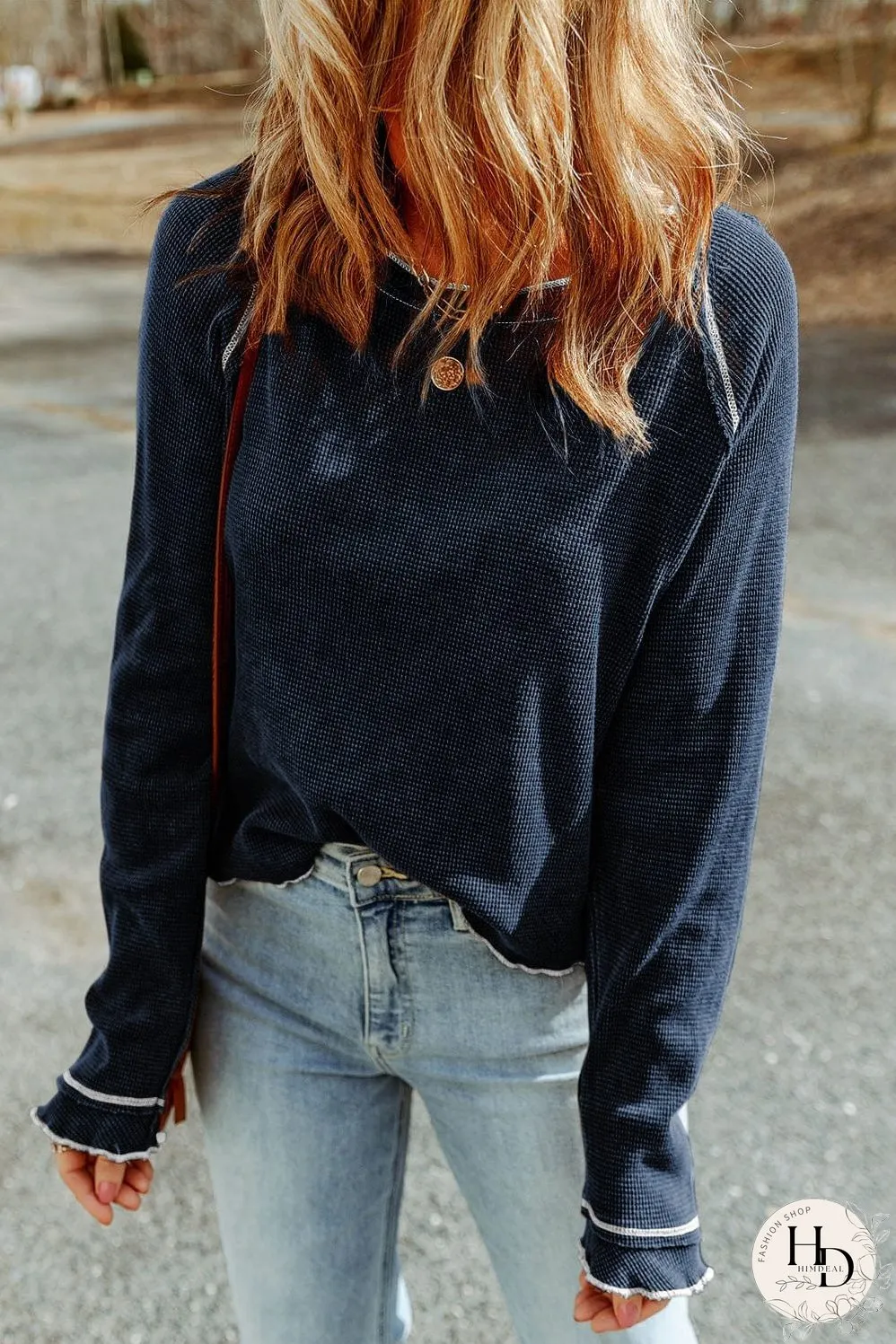 **Elevate your wardrobe with this must-have Blue Textured Round Neck Long Sleeve Top.** Its unique texture and flattering **round neckline** make it a standout piece for any occasion. Crafted from a cozy **Waffle Knit fabric** (95% Polyester + 5% Elastane), this top ensures all-day comfort and style.