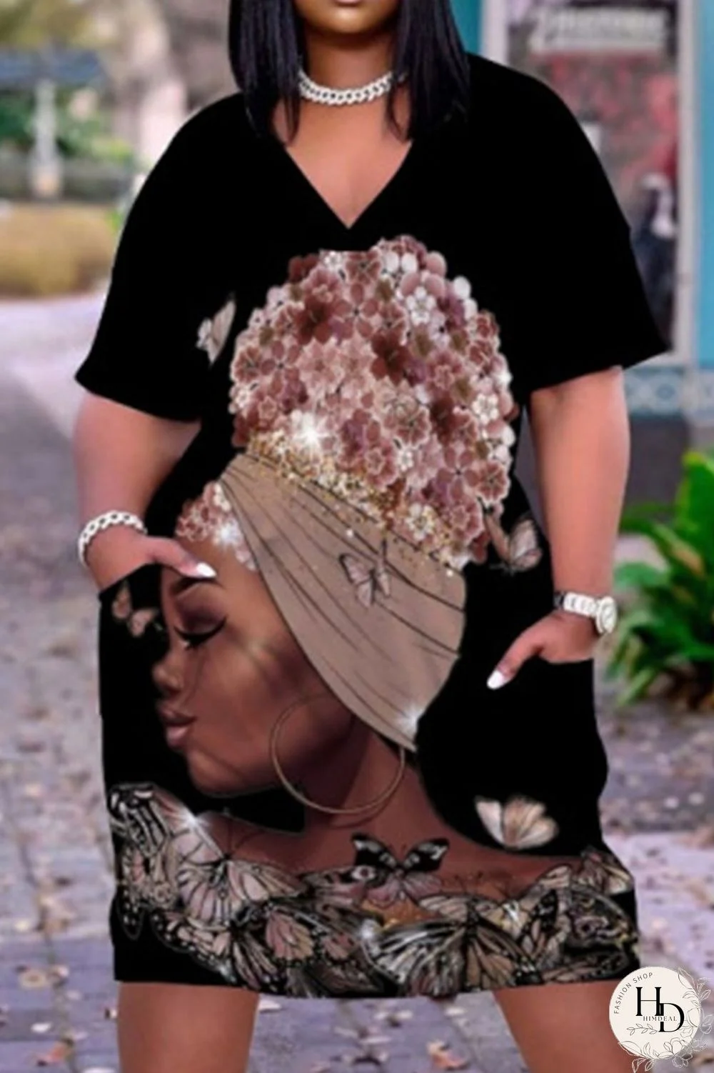 | Product Name | Black Casual Print Patchwork V Neck Straight Dresses |