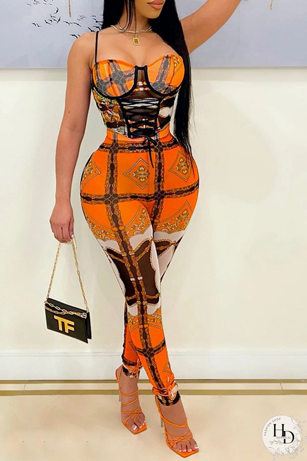 | Product Name | Tangerine Red Sexy Print Split Joint Spaghetti Strap Sleeveless Two Pieces |