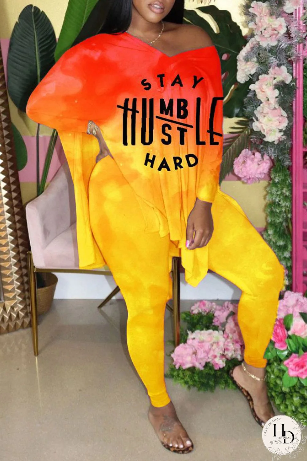 | Product Name | Yellow Fashion Casual Gradual Change Letter Print Slit V Neck Plus Size Two Pieces |