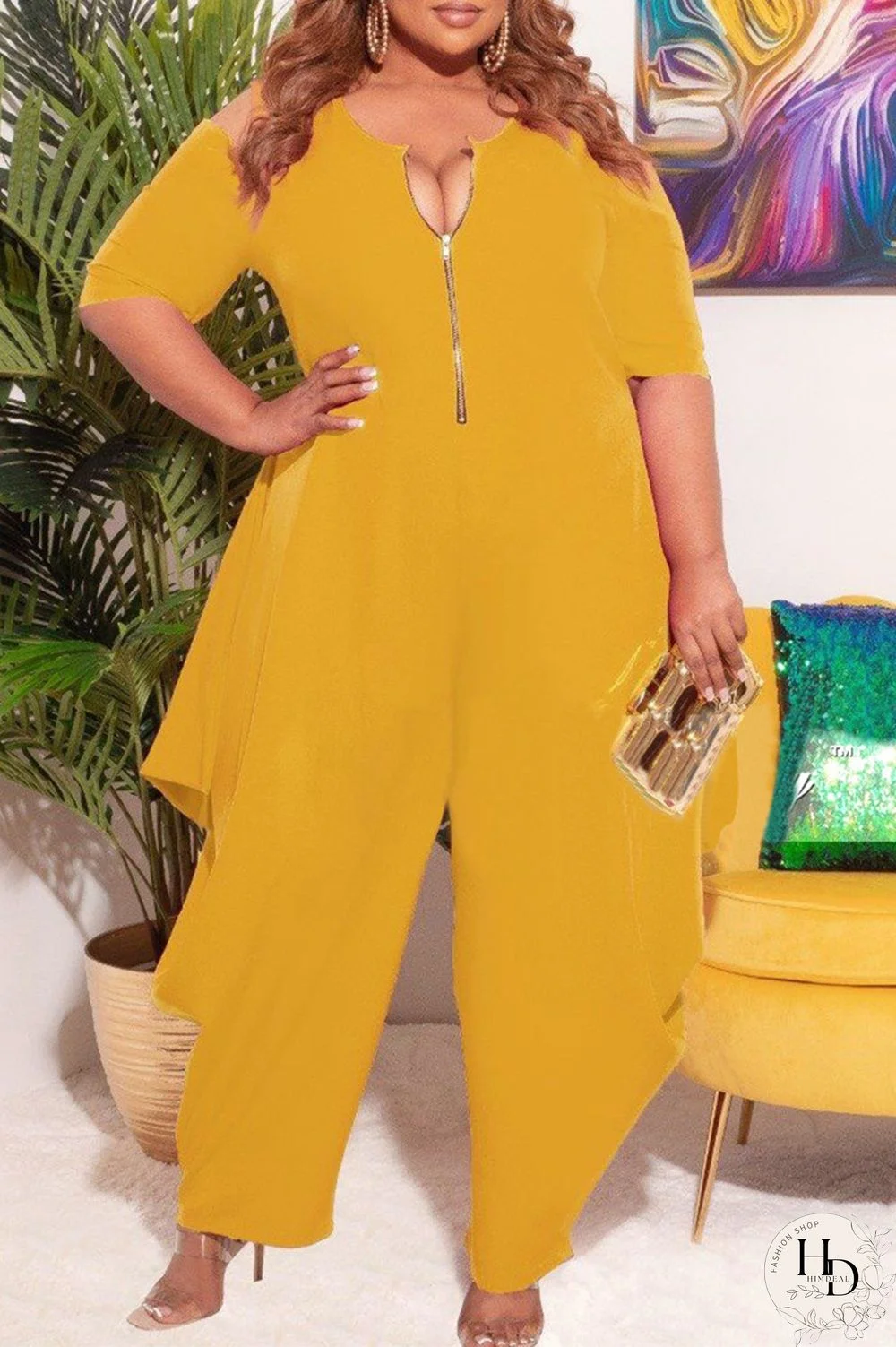 | Product Name | Yellow Fashion Casual Solid Hollowed Out Zipper Collar Plus Size Jumpsuits |