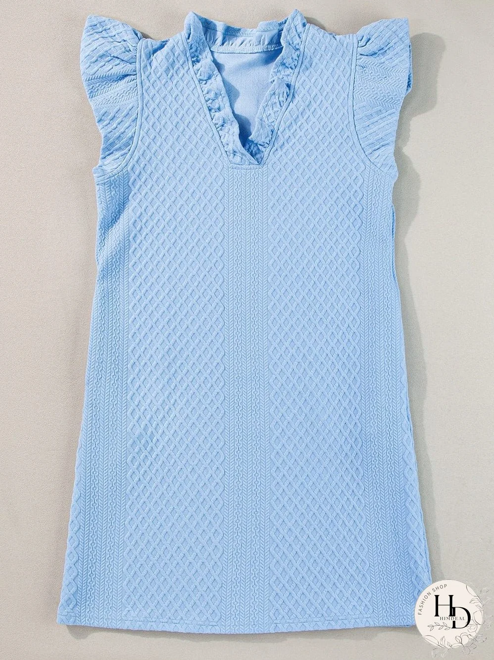 Effortlessly chic, this light blue mini dress features a flattering V-neck, charming ruffles, and adorable puff sleeves. The quilted texture adds a touch of sophistication, while the shift silhouette ensures comfortable all-day wear. Perfect for any occasion!