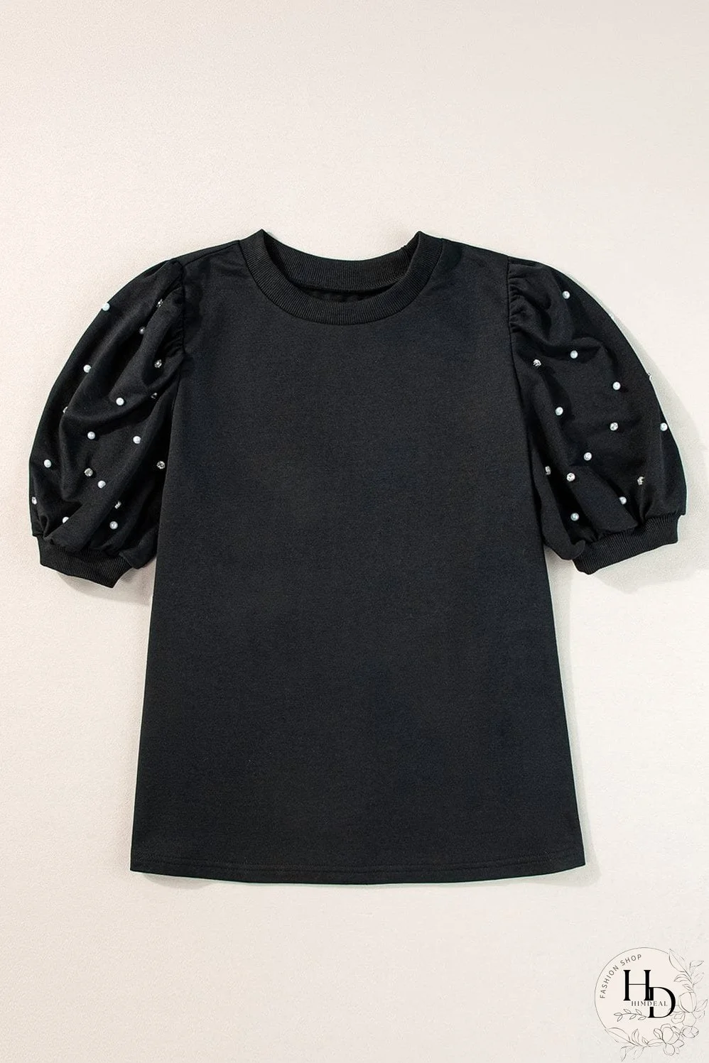 Elevate your style with this elegant black puff sleeve blouse. Adorned with delicate pearls and rhinestones, it adds a touch of sophistication to any outfit. The comfortable fabric and flattering puff sleeves create a chic and modern look, perfect for both casual and dressy occasions. Make a statement with this versatile piece!