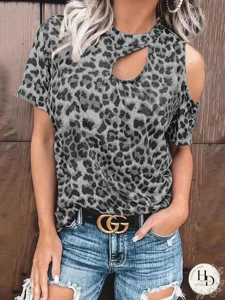 Elevate your style with our Off-Shoulder Leopard Print Hollow Short Sleeve T-Shirt! This chic top features a trendy off-shoulder design, a unique keyhole cutout, and a timeless leopard print. Available in brown, gray, and purple, it's versatile enough for any occasion. The soft fabric ensures all-day comfort. Add a touch of wild to your wardrobe today!