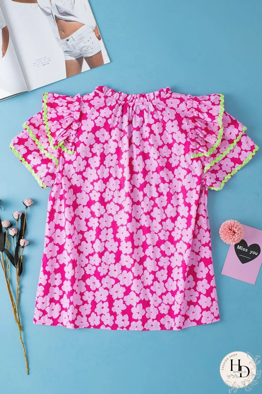 Elevate your style with our Pink Blossom Ruffle Sleeve Blouse! This charming top features a vibrant pink floral print, playful ruffles, and a chic V-neckline. The bright neon green ric rac detail adds a fun, modern touch. Perfect for casual outings or dressed up with jeans, it's a versatile piece for any wardrobe. Shop now and add a pop of spring to your look!