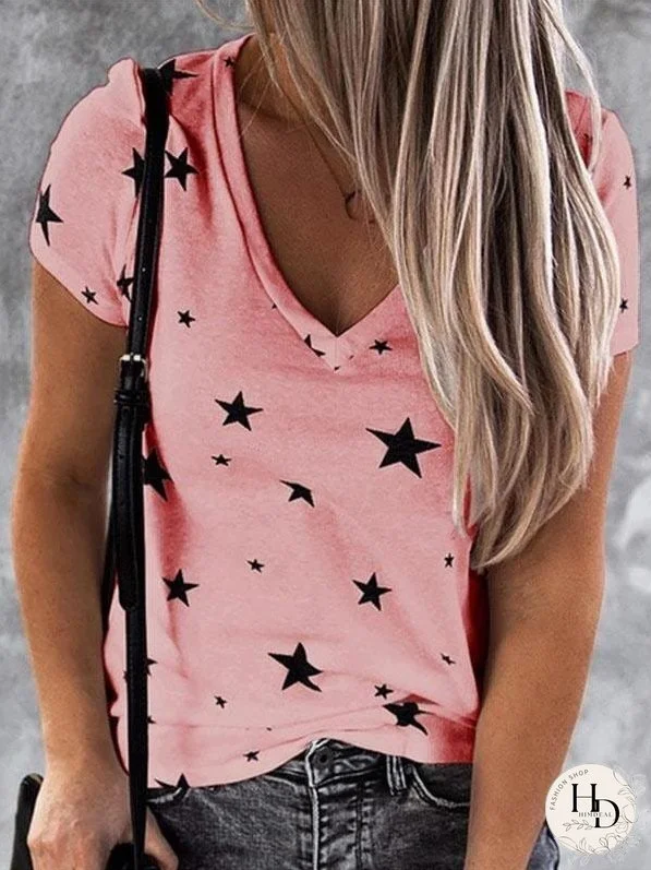 Shine bright in our V-neck Star Print Short-sleeved T-shirt! This stylish top features a flattering drop shoulder and an adorable all-over star print. Available in white, grey, and beige, it's effortlessly chic and perfect for any occasion. Upgrade your wardrobe today!