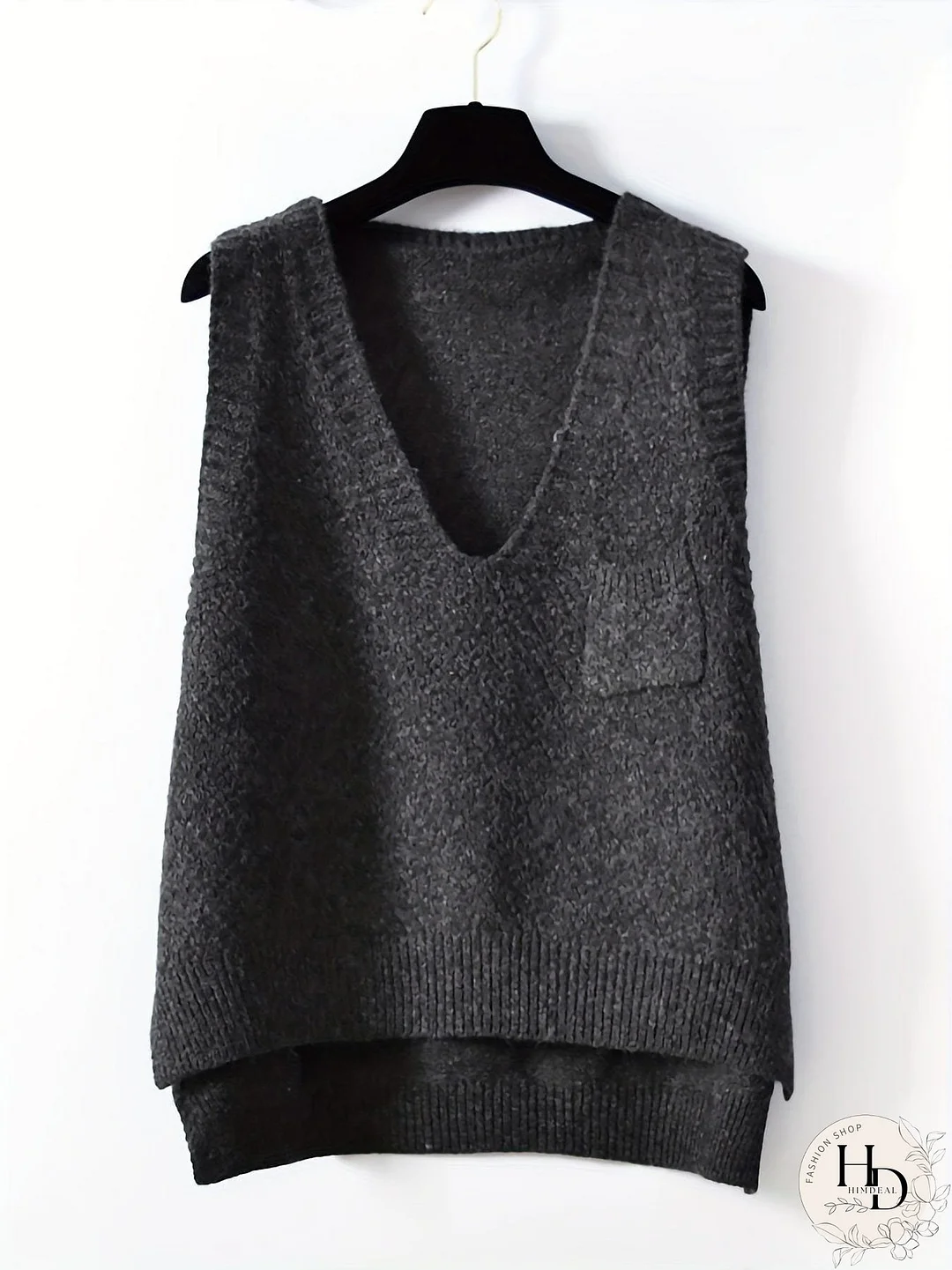 Cozy up in this stylish V-neck knit sweater vest! Its soft, brown speckled texture and relaxed fit add effortless chic to any outfit. The unique, slightly longer back hemline and handy front pocket complete the look. Upgrade your wardrobe with this versatile piece perfect for layering.