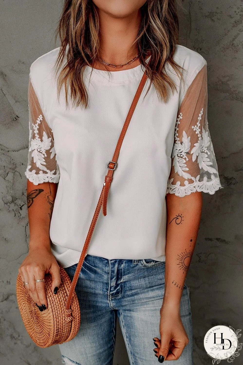 This white top features a beautiful patchwork design with floral lace sleeves, adding a touch of elegance to your look. The sheer floral mesh sleeves create a unique and stylish appeal.