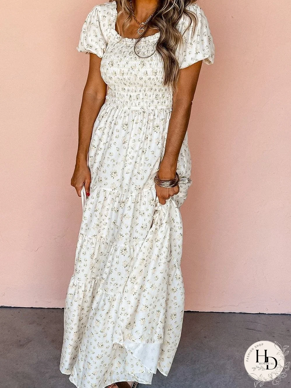 White Frilly Shirred Bodice Tiered Floral Maxi Dress
