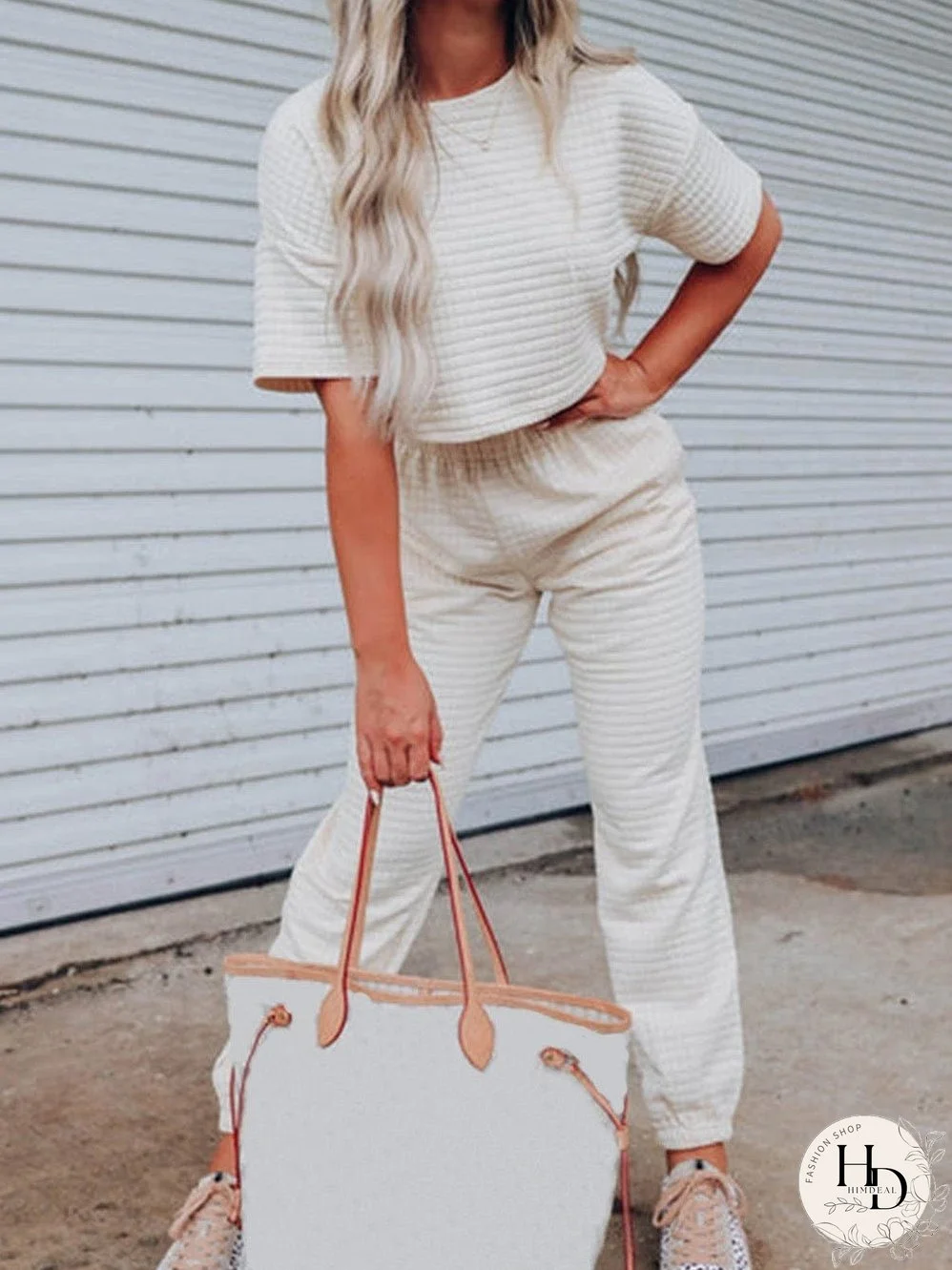 White Lattice Textured Cropped Tee and Jogger Pants Set