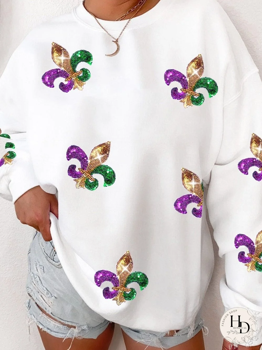 Stand out from the crowd with the eye-catching White Sequin Mardi Gras Graphic Pullover Sweatshirt. Shimmer and shine with Mardi Gras symbol patterns adorned with sequins, perfect for bringing a touch of carnival spirit to your wardrobe.