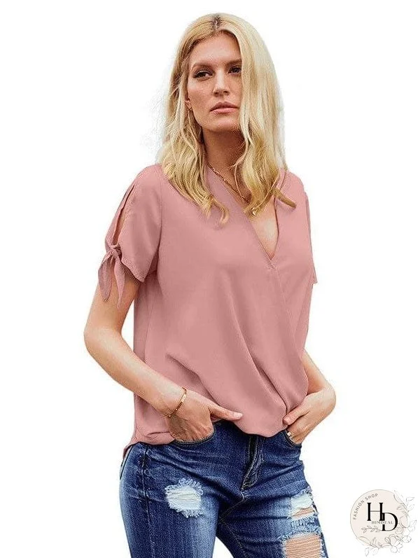 Elevate your style with this versatile women's blouse! Featuring a flattering wrap design, chic short sleeves with a knot detail, and a comfortable loose fit, it's perfect for any occasion. Available in classic beige and black, it effortlessly pairs with jeans or skirts. Upgrade your wardrobe today!